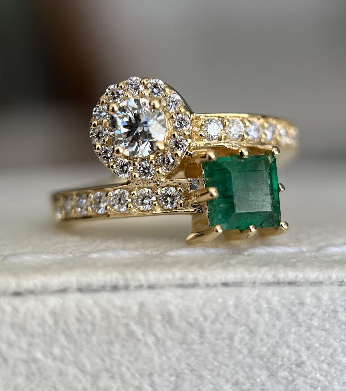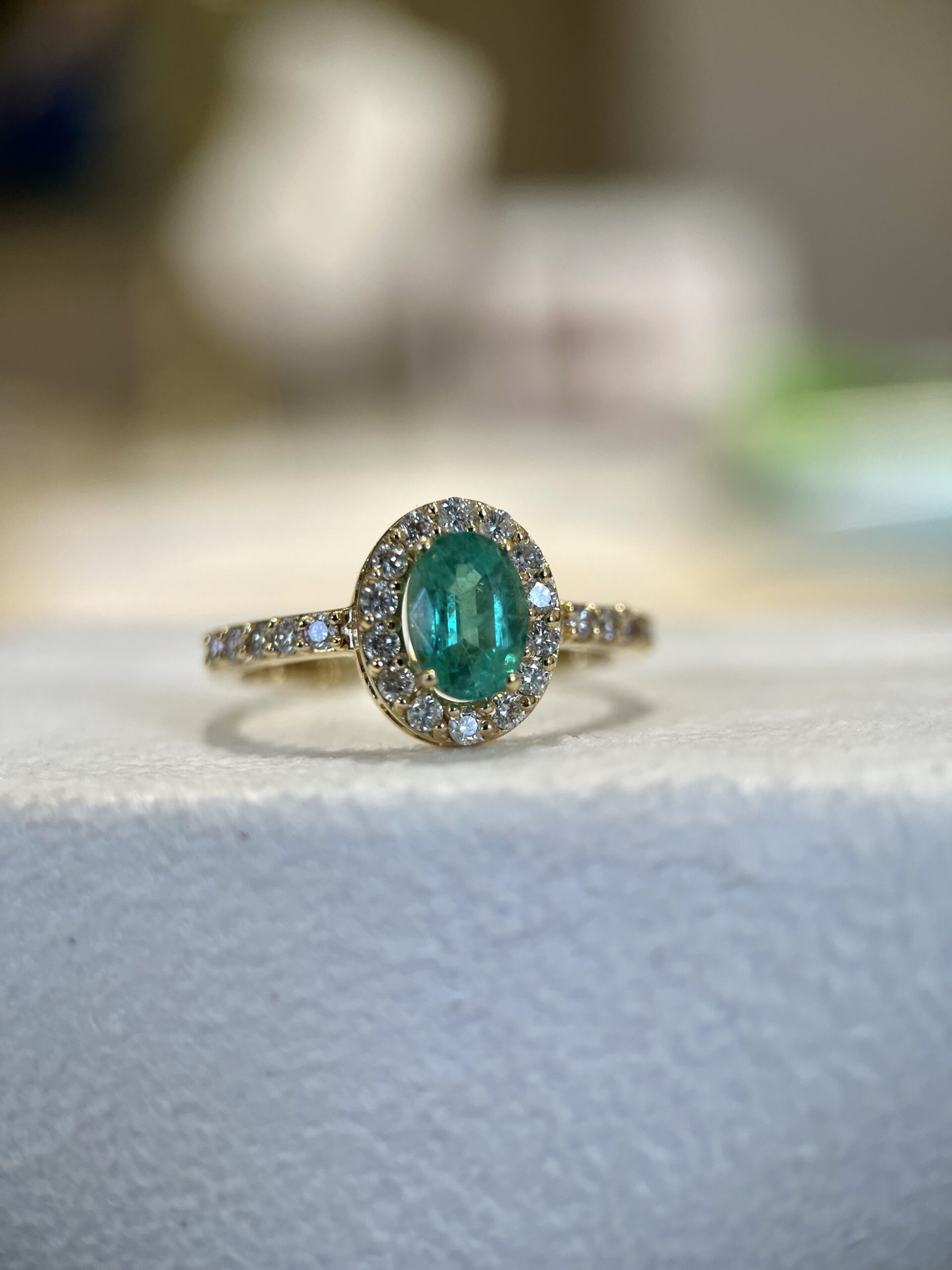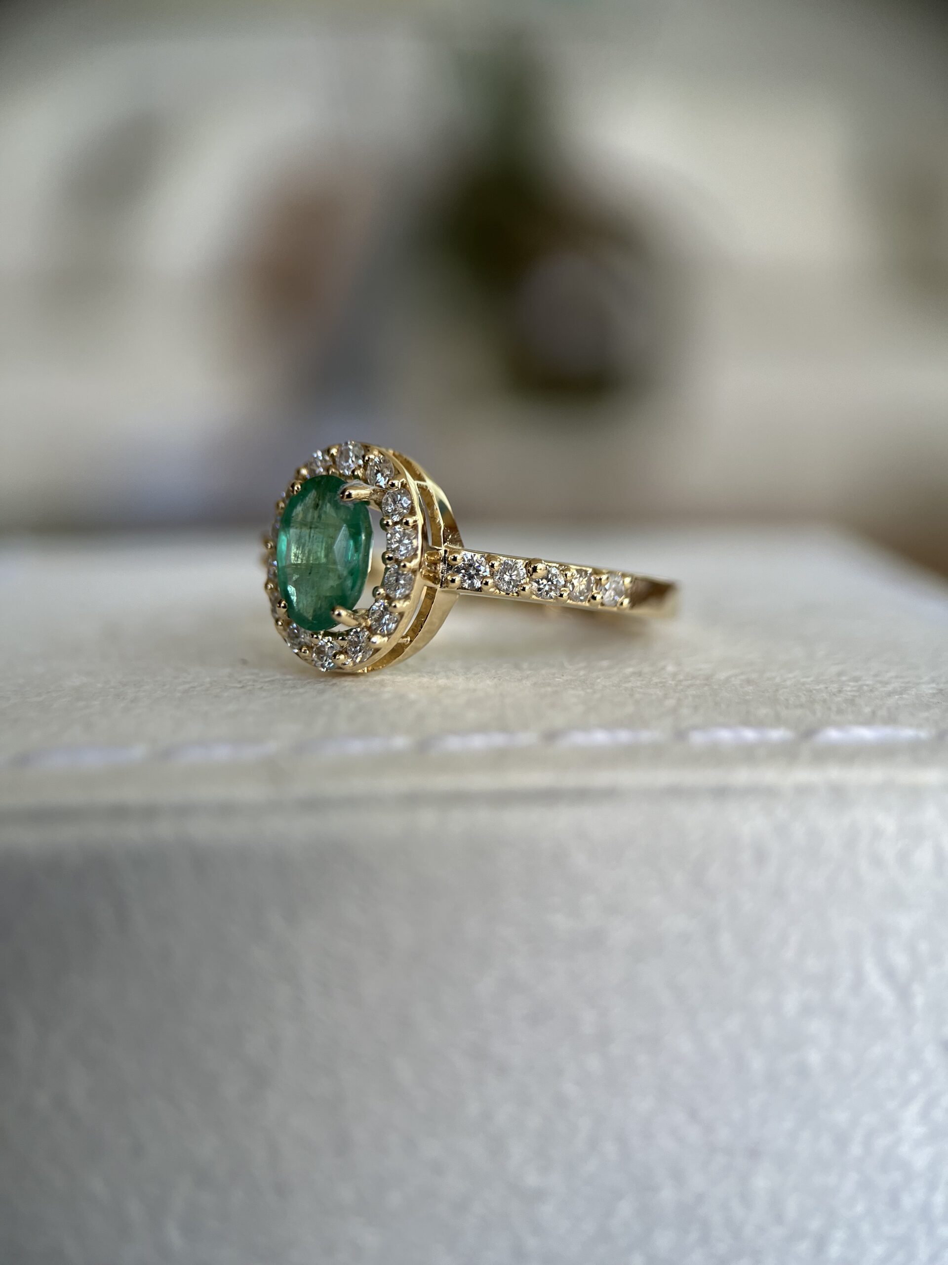 Anel em ouro 18K com uma esmeralda central de cor intensa, acompanhada por 24 diamantes naturais de 1.5 mm, totalizando 0.36 ct. Uma joia imponente, com presença de ouro e acabamento refinado.