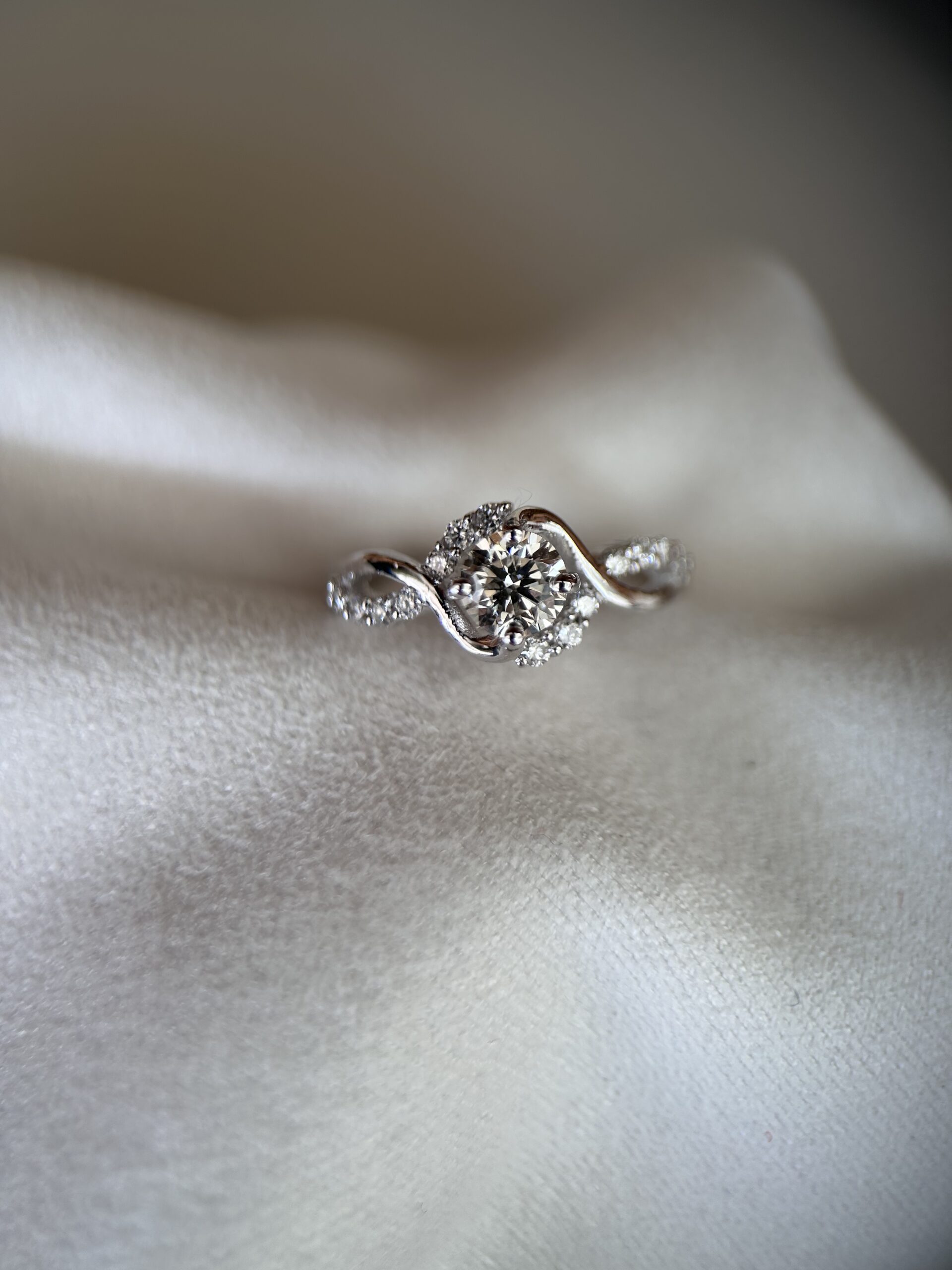 No centro, um diamante de 40 pontos, de brilho preciso e proporções equilibradas, certificado pelo GIA. Ao redor, quatorze diamantes cuidadosamente cravados, que acompanham o movimento do aro e ampliam a luz da pedra central com delicadeza.