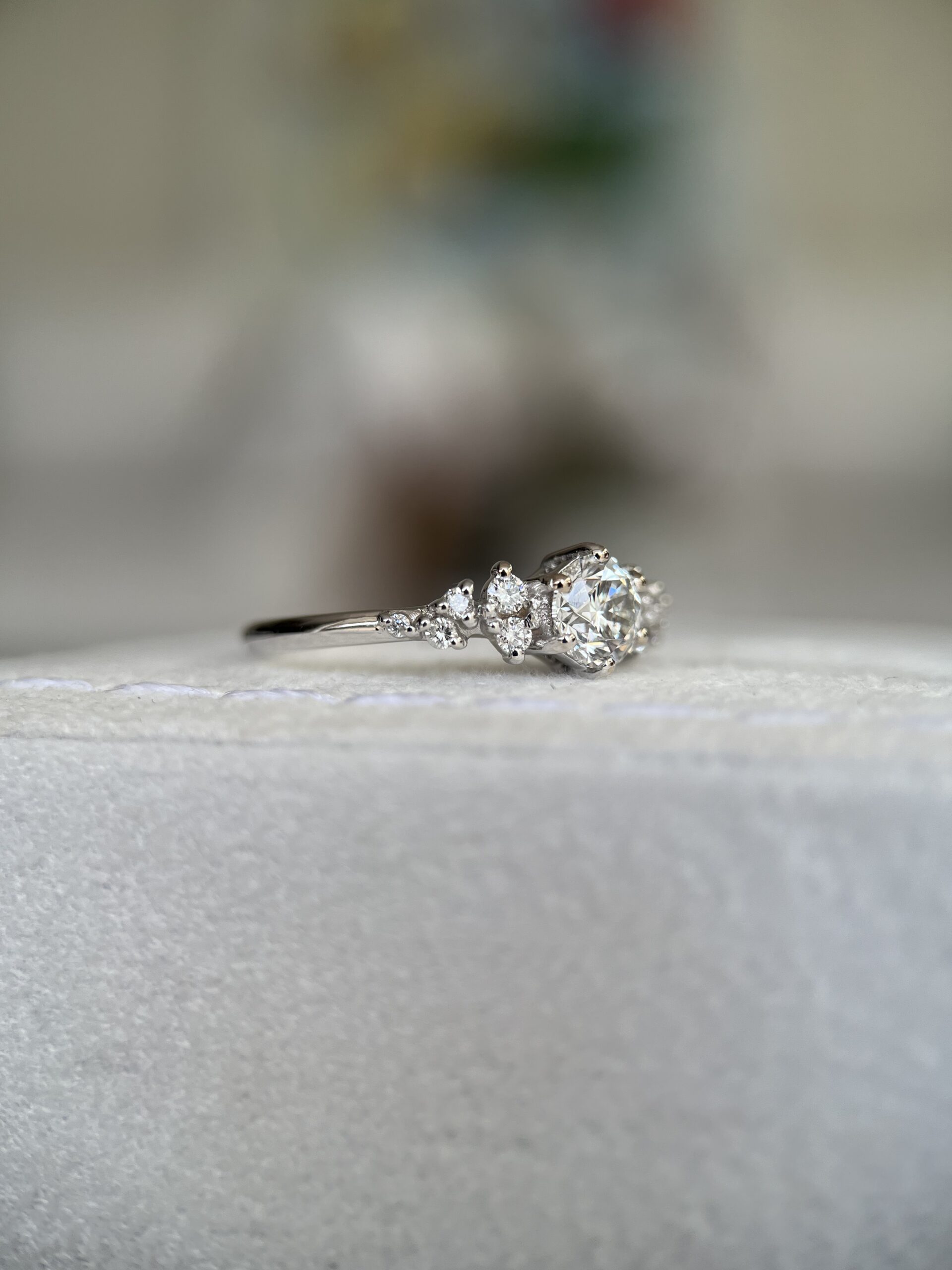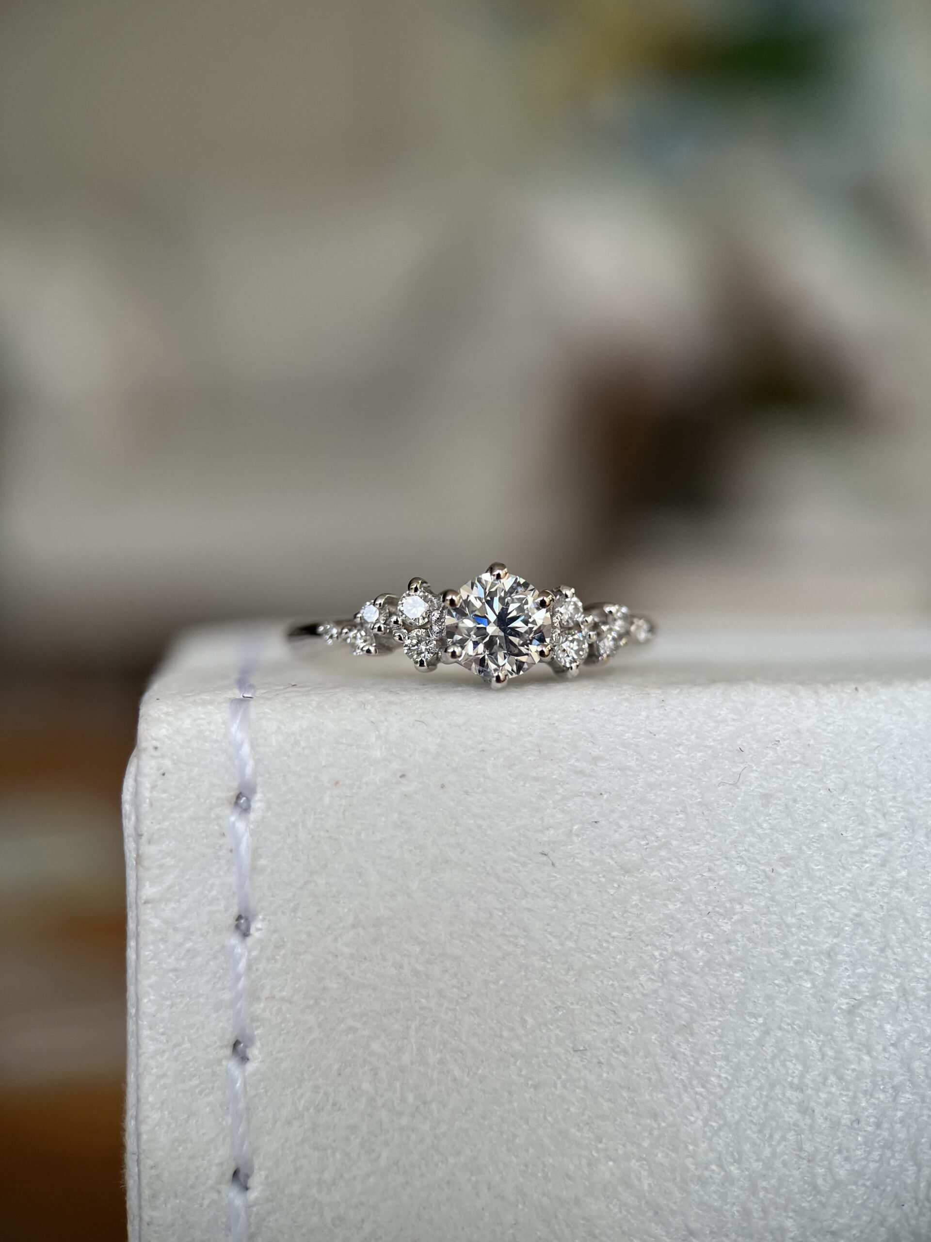 No centro, um diamante redondo de 0.50ct, certificado pelo GIA, cor H VS, símbolo de pureza e brilho eterno. Essa pedra pode ser personalizada de acordo com o desejo da cliente ,sempre com a mesma atenção em oferecer apenas gemas de altíssimo padrão.