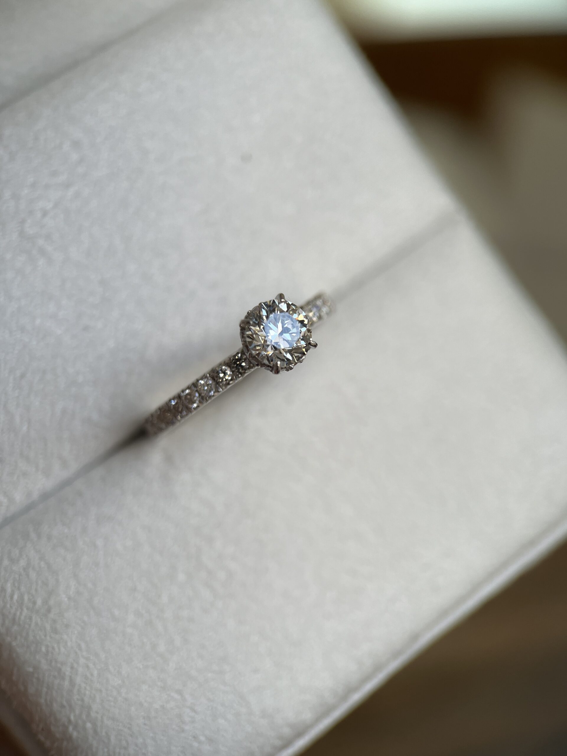 Anel de ouro 18k com diamante central de 12 pontos e 26 diamantes laterais.