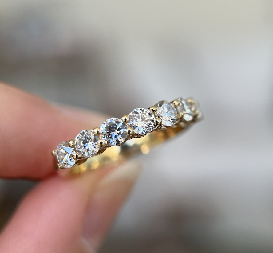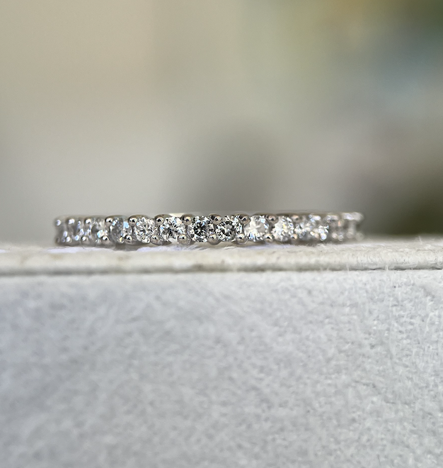 O aro fio faca confere identidade à peça: visto de cima, cria a impressão de extrema delicadeza; de perfil, revela uma estrutura espessa e bem construída, com presença de ouro e excelente resistência. Esse contraste sutil é o que torna o anel especial.