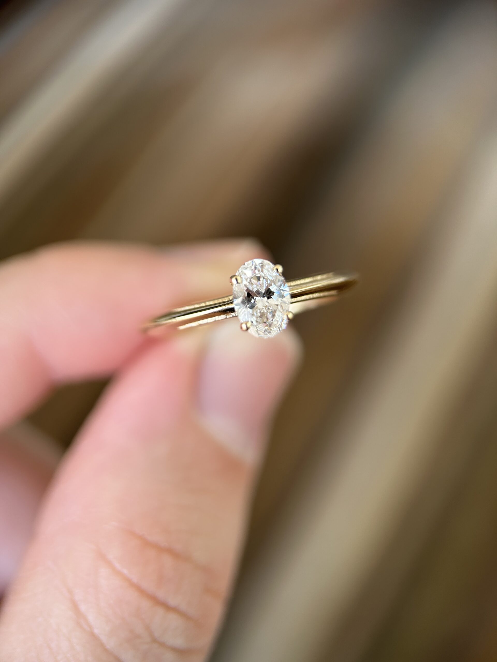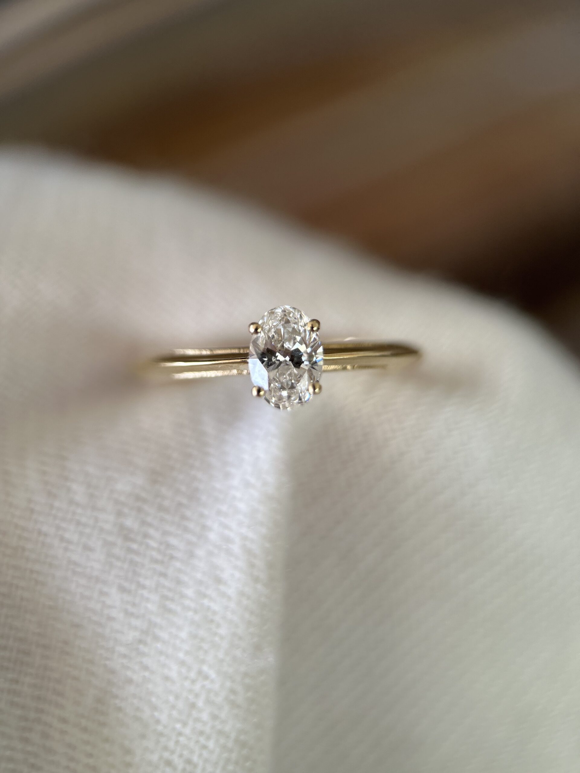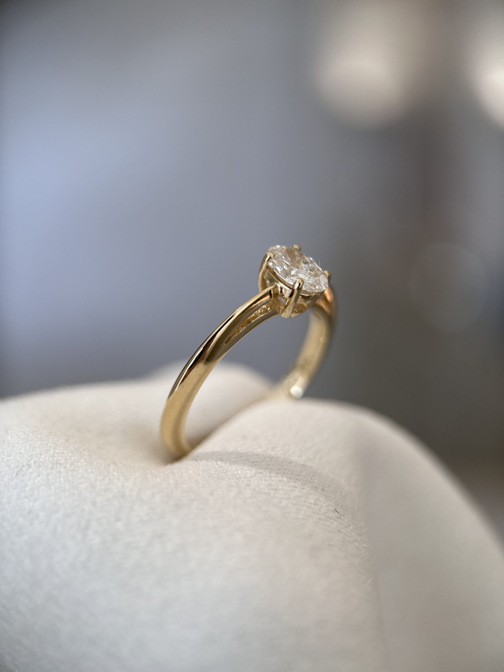 Um solitário de desenho refinado e moderno, em ouro 18k, que equilibra elegância clássica com uma estética contemporânea. No centro, um diamante oval de 0,50 quilates se destaca com brilho limpo e proporções harmoniosas.