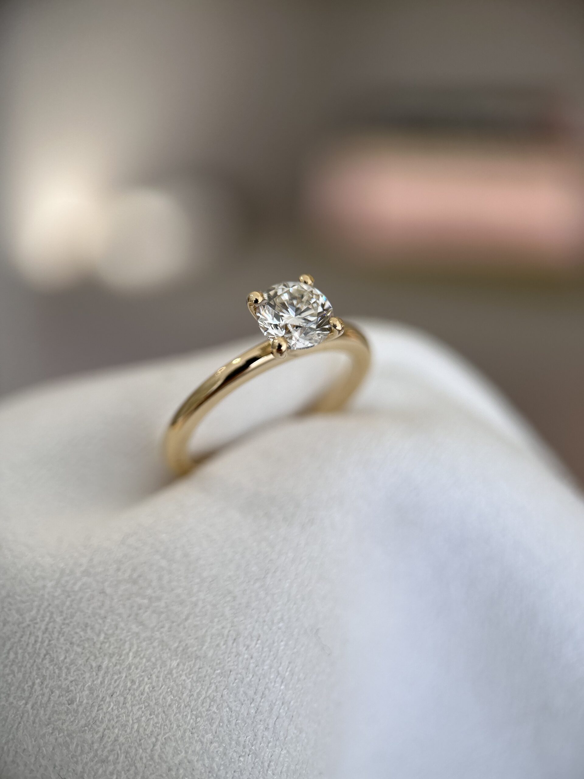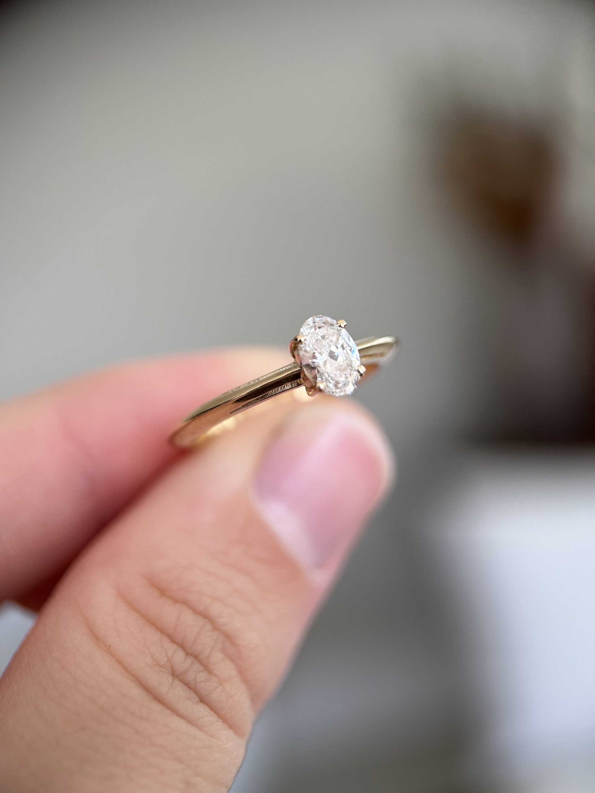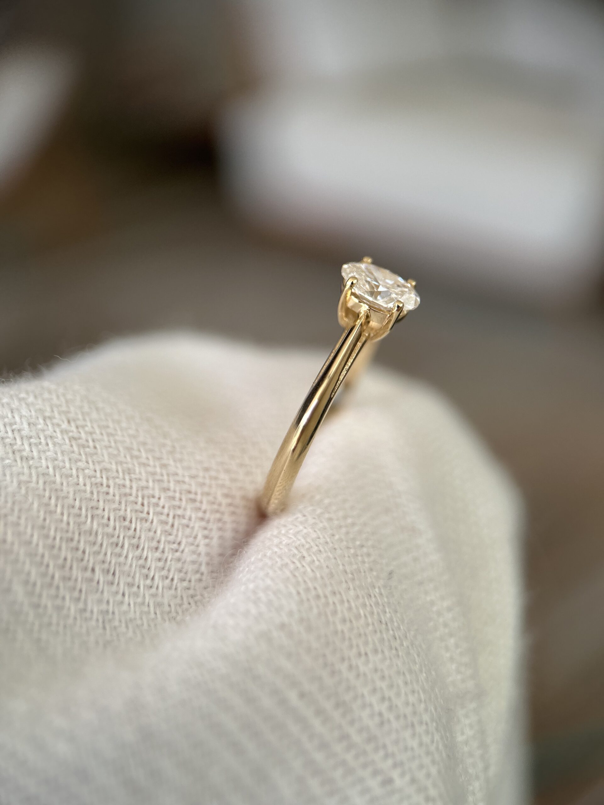 Um solitário de desenho refinado e moderno, em ouro 18k, que equilibra elegância clássica com uma estética contemporânea. No centro, um diamante oval de 0,50 quilates se destaca com brilho limpo e proporções harmoniosas.